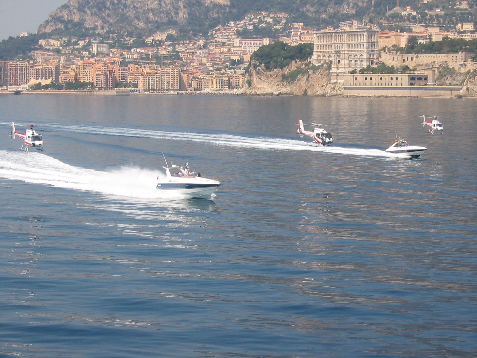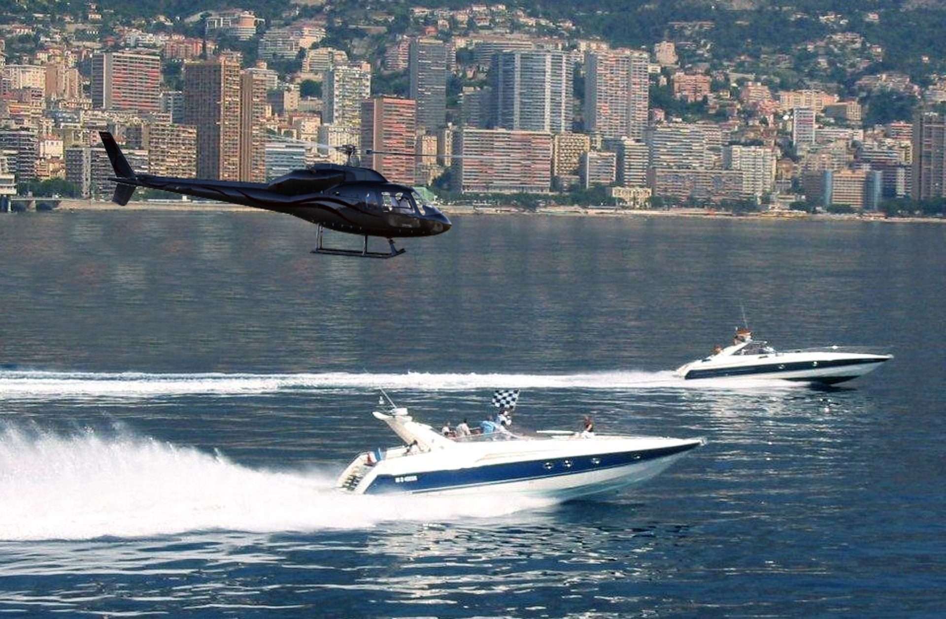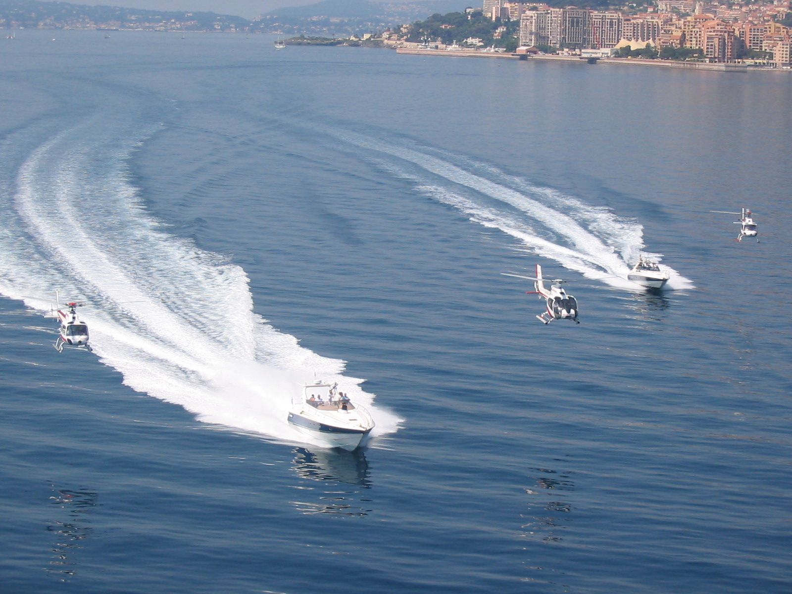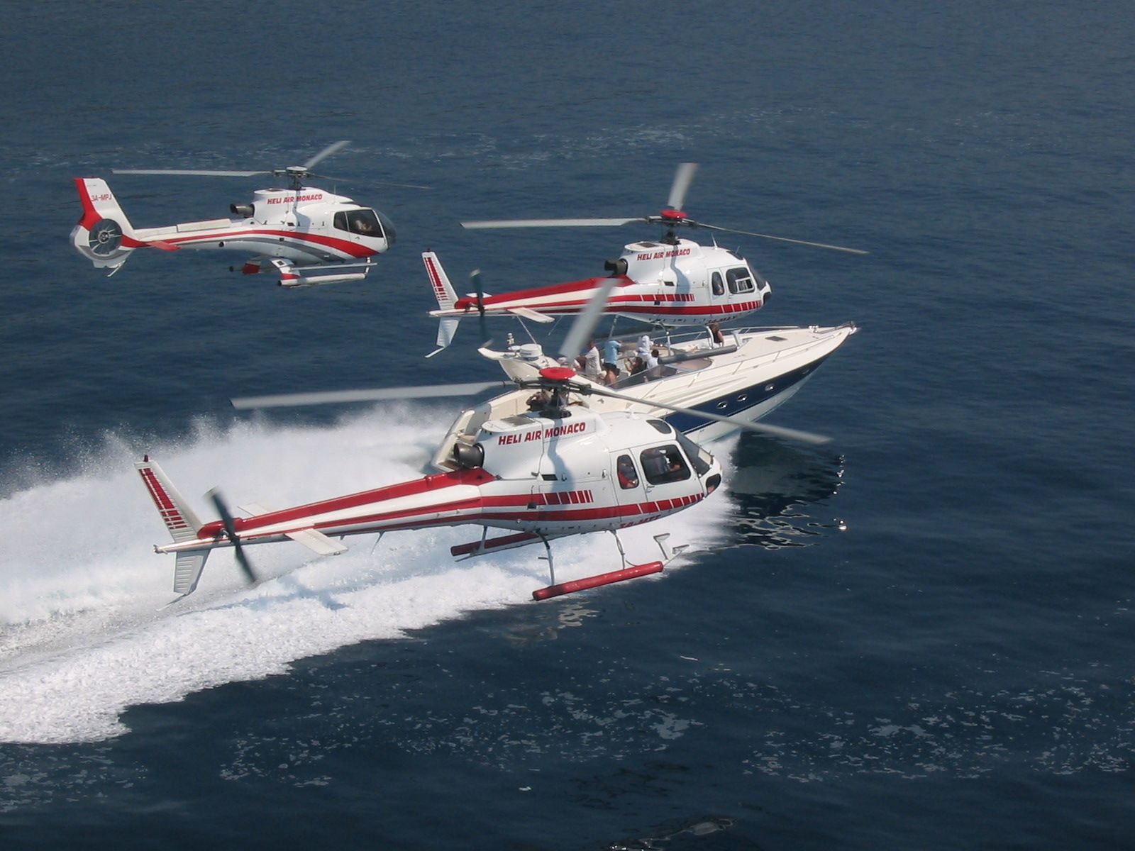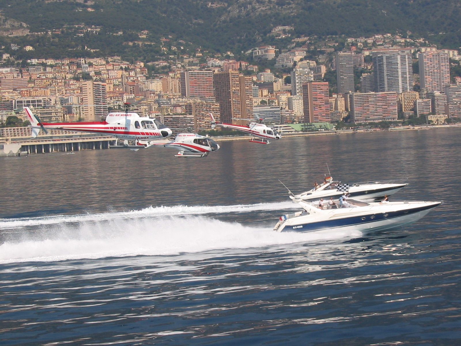 Monaco, Fontvieille harbor and heliport. 1-2 Offshore Superhawk 48/50 - maximum10 passengers, 1500HP power, speed 45/50 knots (90/100km/h) - maximum 4 helicopters with 5 passengers each.
